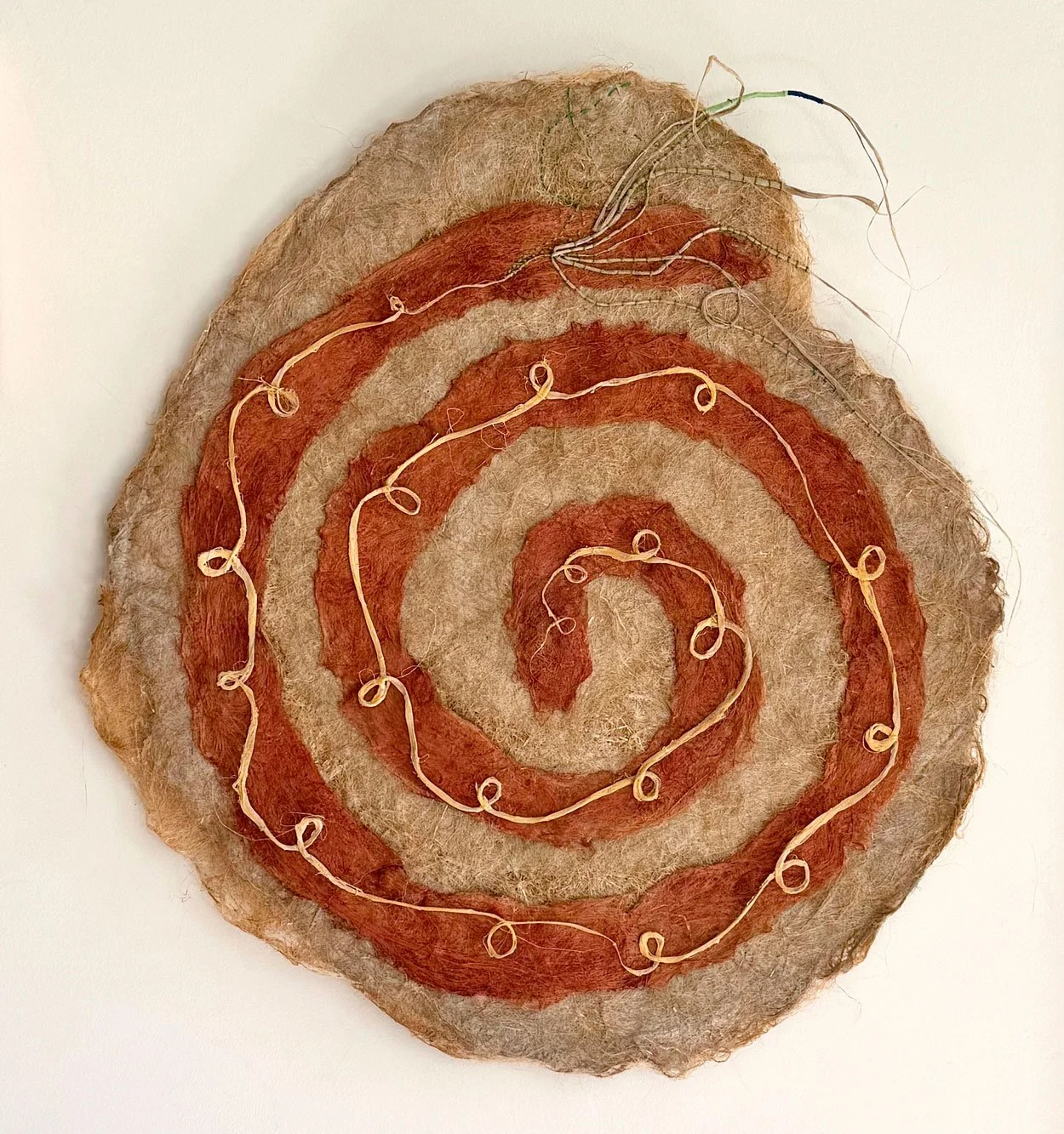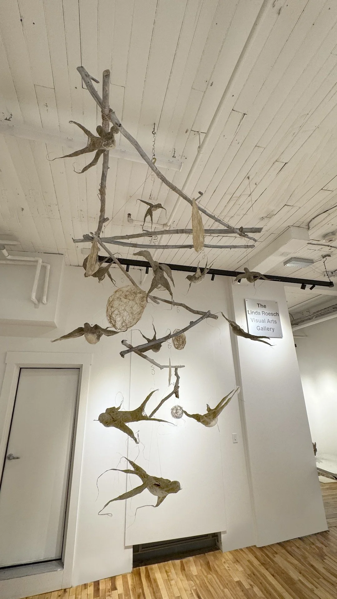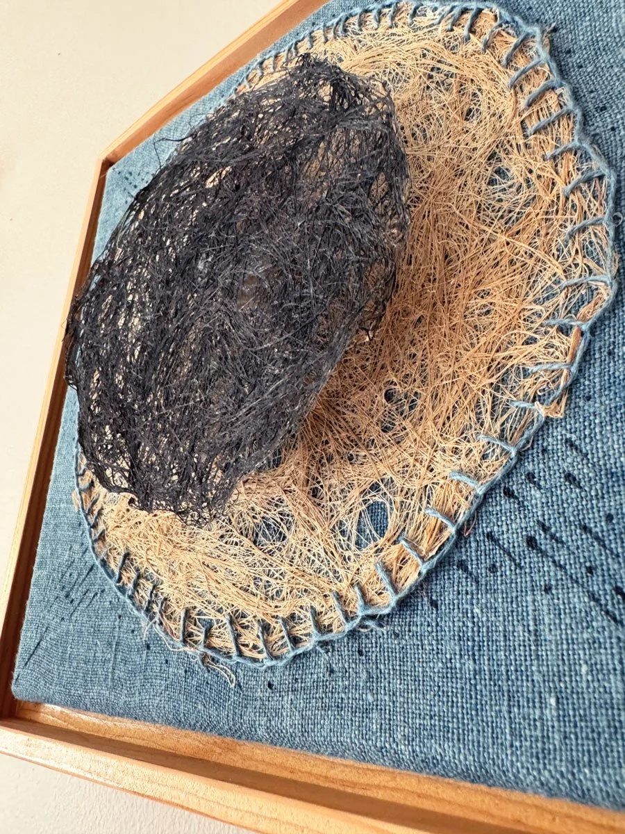 I apply techniques I learned from Belgian artist Germana Tack in 2024. Using flax from my own field, mixed with Belgian and Egyptian flax, I explore themes of roots and cycles, migratory patterns and flight. With wire mesh, thread, and flax, I create barn swallows of varying sizes and flight positions. When suspended overhead, their orientation suggested the evening pattern of flycatchers rising and falling as they look for insects. Viewers could touch and rotate the piece to set the birds into motion. The most recent addition to my flax odyssey is indigo dye.