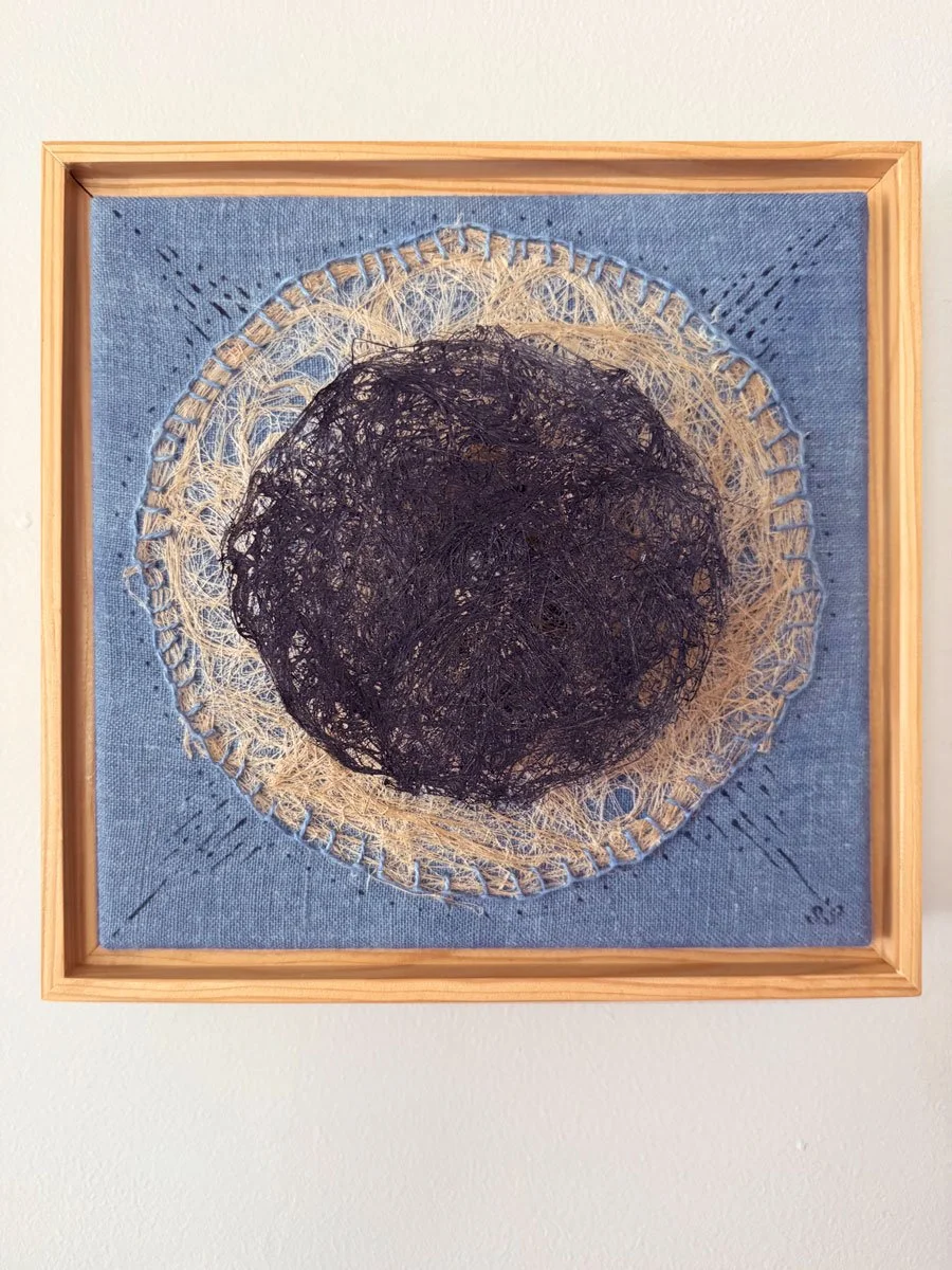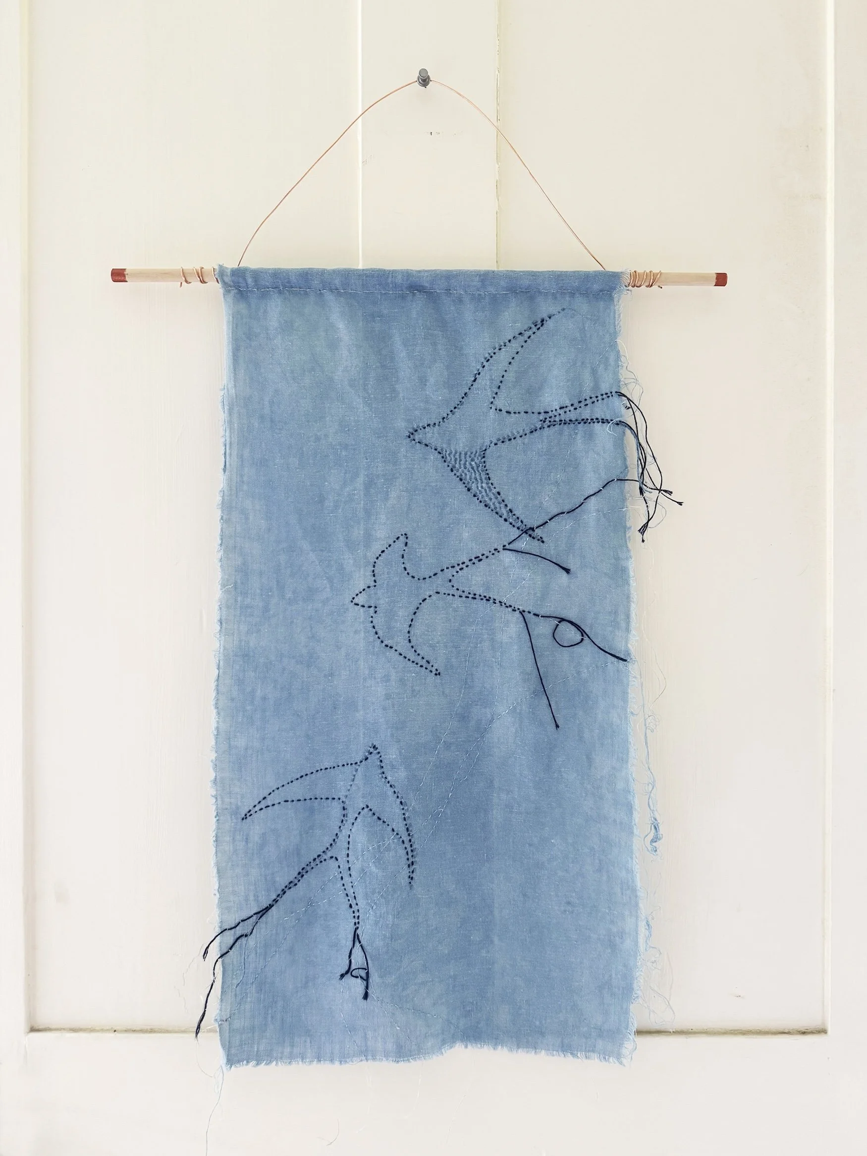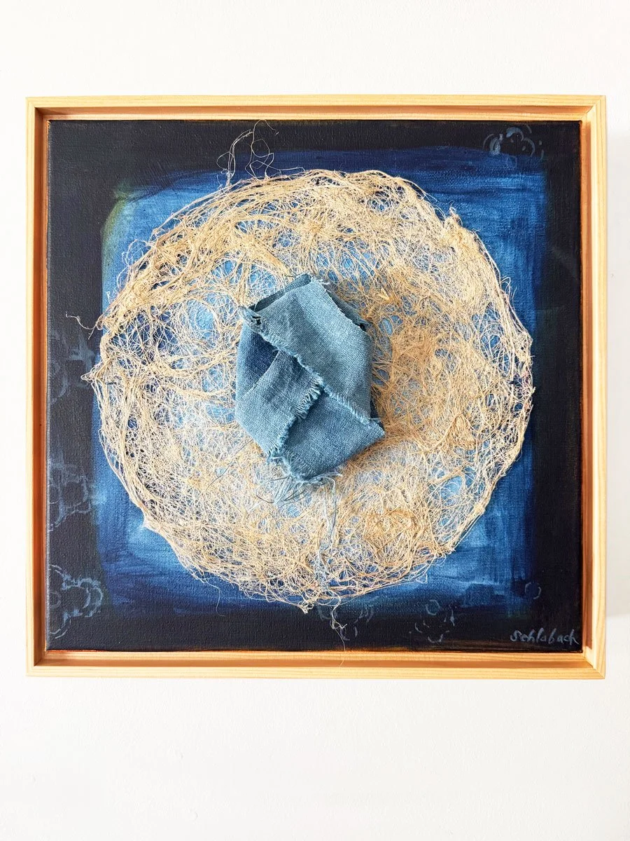 I learned indigo vat dyeing from Pamela Wilson through Green Mountain Linen in August of 2025. This is the work I created from the flax and linen I dyed with indigo. Inquire to purchase.