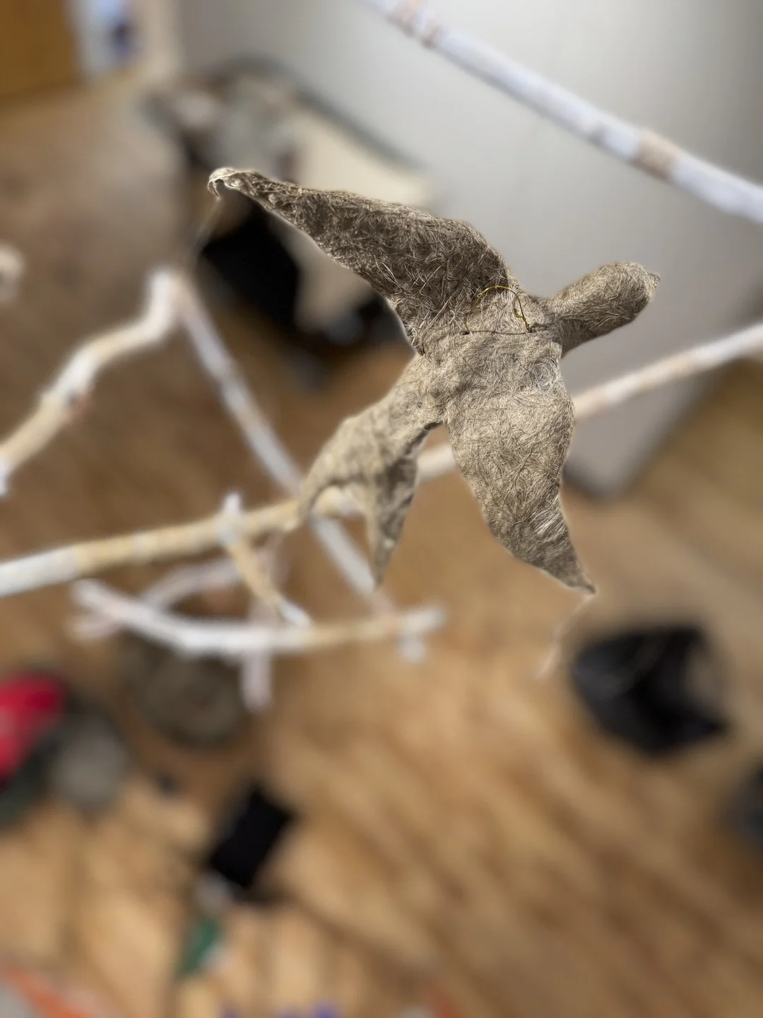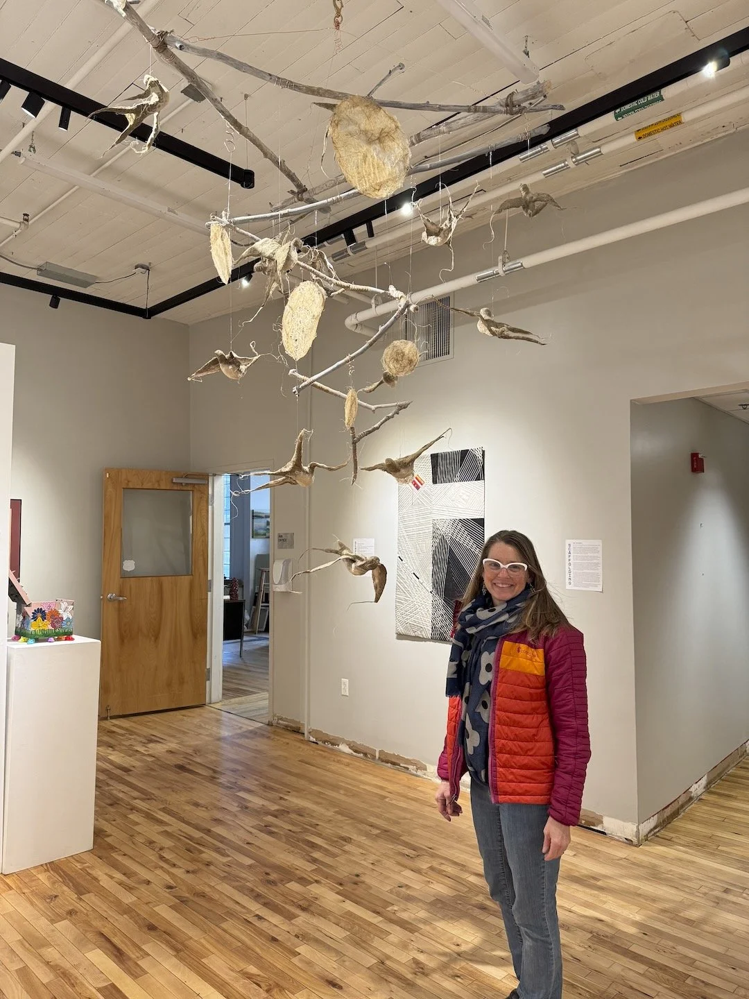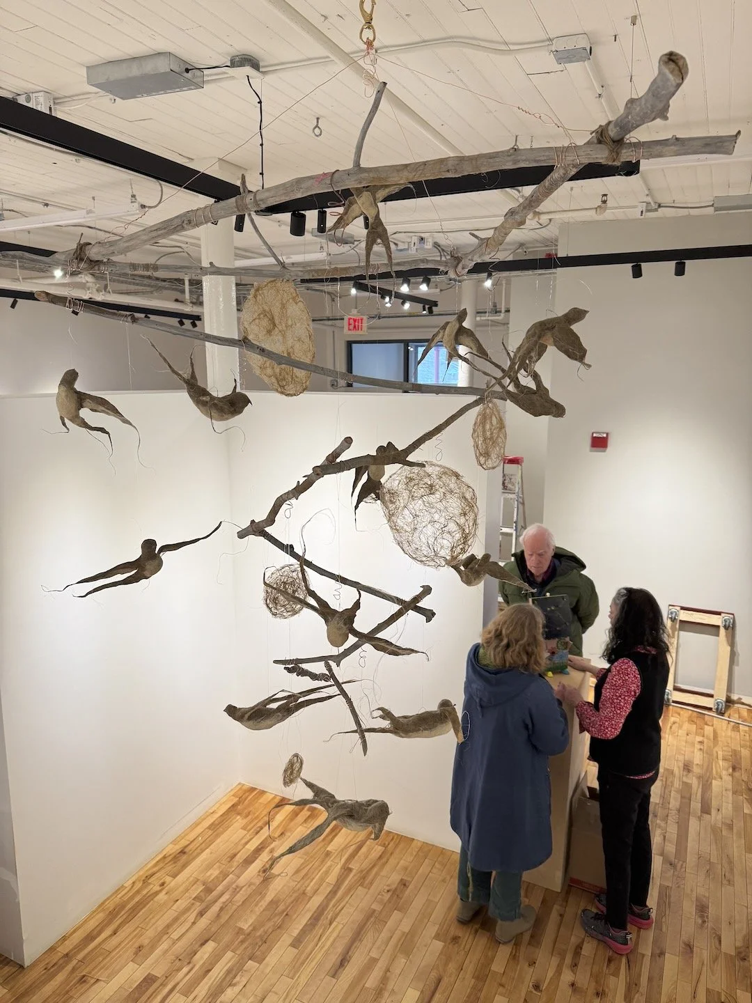 I created this installation for the Scaffolding Exhibit at the AVA Gallery in Lebanon, New Hampshire in January 2025. The piece is flax, wire mesh, wood, copper wire and monofilament. It measured about 40” wide by 6 feet high.